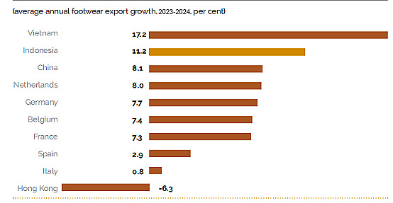 By the end of 2024, Indonesia will have approximately 1,500 footwear manufacturers, half the number of Vietnam, with exports increasing by 11.2% year-on-year, mainly concentrated in Java and Sumatra, particularly in West Java, East Java, and North Sumatra. In Bogor City, West Java Province, there exists a cluster of footwear industries where production is distributed across 14 villages, each focusing on a specific type of footwear, such as sandals, children’s shoes, or sports shoes. Besides West Java, both formal and casual footwear production predominantly occurs in Yogyakarta, North Sumatra, and East Java.